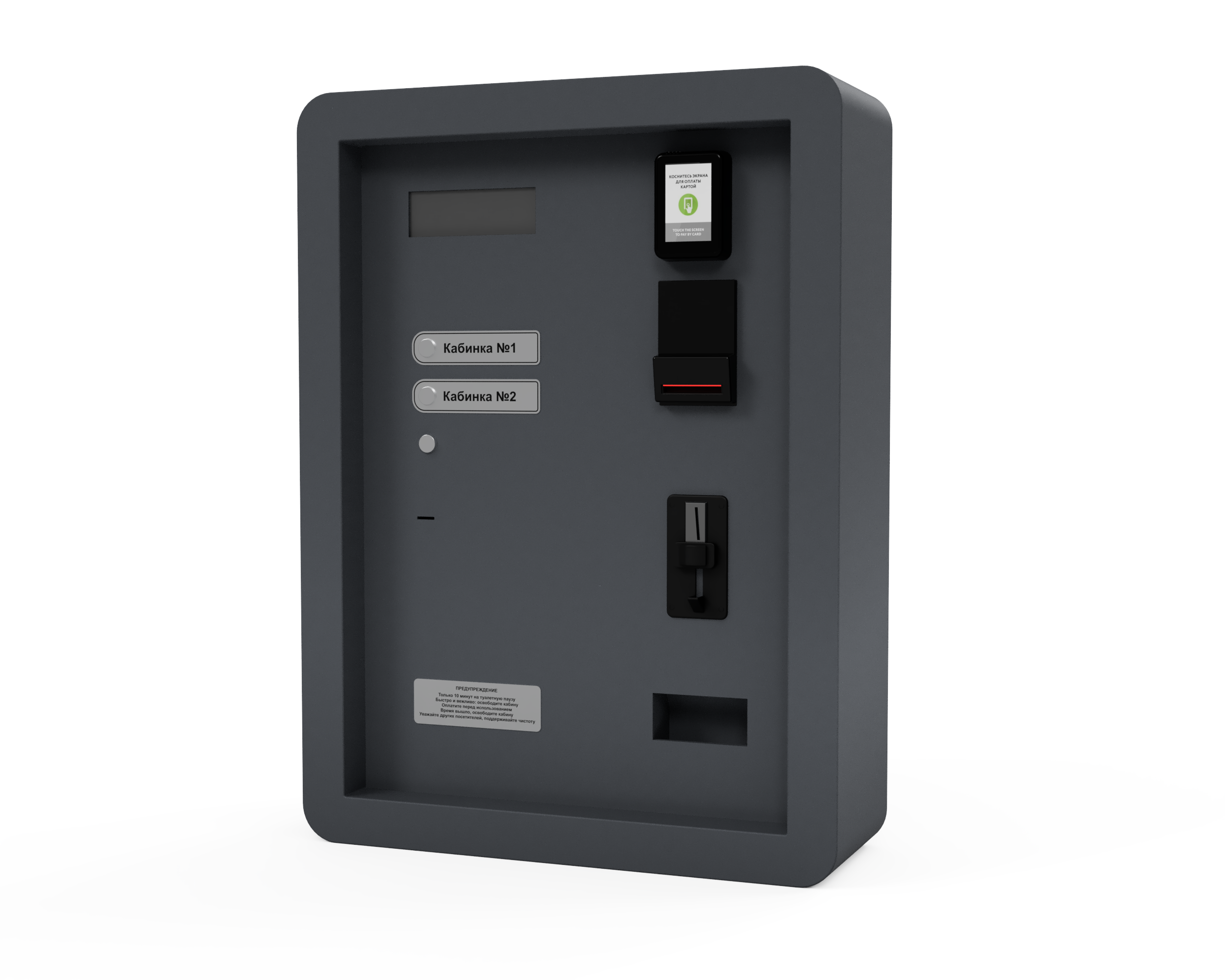 Платёжный терминал изготовлен в прочном сварном металлическом корпусе с толщиной стенок от 2 до 3 мм. Дверца для обслуживания и инкассации расположена на лицевой стороне и оборудована сейфовым ригельным замком. Корпус покрыт износостойкой порошковой краской.