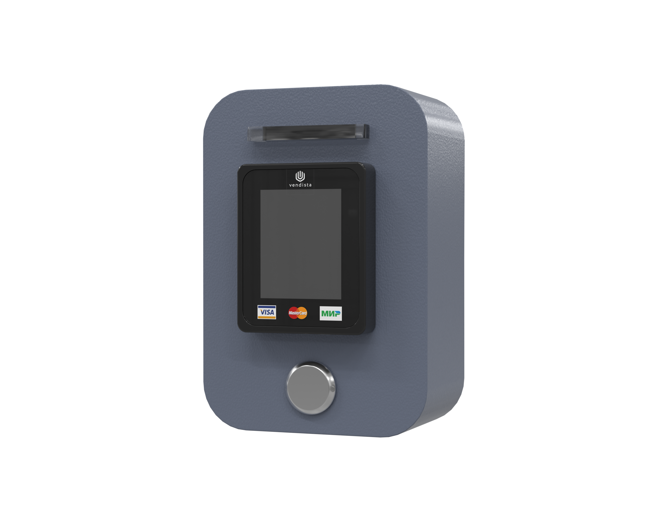 Корпус терминала выполнен из металла с порошковым покрытием. На передней панели расположены банковский POS-терминал, сверхъяркие RGB-светодиоды и считыватель карт для доступа персонала. Модель оснащена встроенным GSM-модемом с SIM-картой для связи с банком.